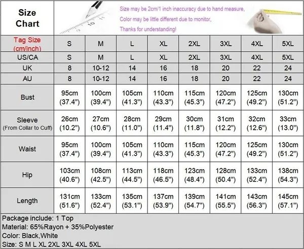 Tag's Size is Asian Size,Please check the detail sizes on the size chart image before you buy it!!! Package included: 1 Top Material: 65%Rayon + 35%Polyester Color: Black,White Size: S,M,L,XL,2XL,3XL,4XL,5XL MK reminder:We use Tag's Size,please allow 1-2cm All measurement in cm and please note 1cm=0.39inch.