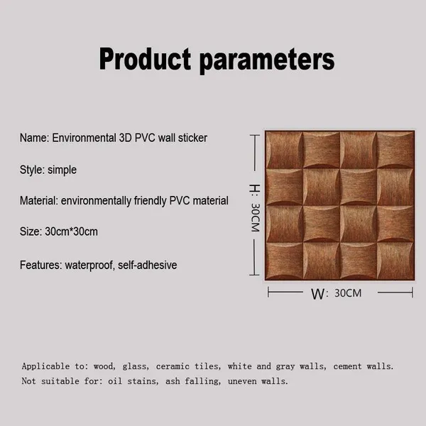 Name: Environmental protection 3D three-dimensional PVC wall sticker Style: simple nordic style Material: high quality ring and PVC material Model: 1,2,3,4,5,6,7,8,9,10 Size: 30cm*30cm/11.8 in* 11.8 in Product features: waterproof, self-adhesive Construction method: self-adhesive, Remove The Protective Film Before Use Applicable to: wood, glass, ceramic tiles, white and gray walls, wallpaper, cement walls. Not suitable for: oil stains, gray walls, uneven walls. Tip: The price of the product is a piece of 30cm*30cm. Please measure the size of the wall to be decorated and purchase the right quantity! Please note: Due to the size limit of the logistics package, please purchase the quantity not to exceed 100 each time. If you need more quantity, please purchase it in multiple times.