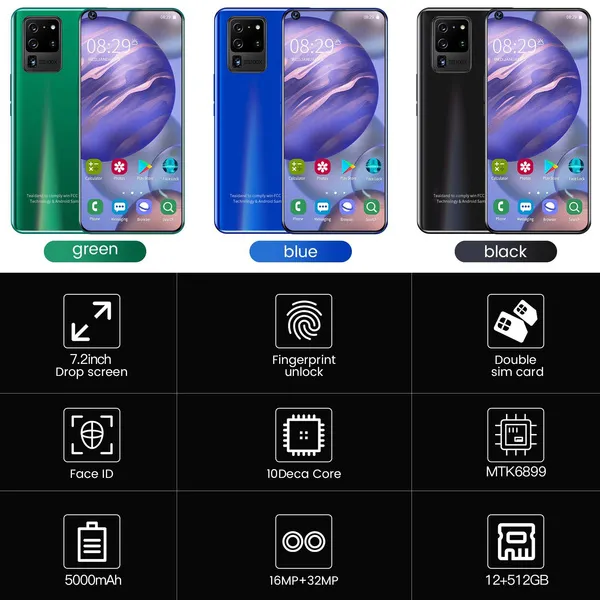 Attention: Note!!!Note!!!Note!!! The smart phone supports GSM / WCDMA network only! The mobile phone does not support the telecom CDMA 2G 3G network! It is not compatible with Sprint and Verizon operators! Factory direct sales, better quality but lower price is our target and mission! Galaxy S20+ Pro Product Features: CPU: MTK6899 Deca Core System: Android 10.0 ROM:16GB/ 512GB RAM: 2GB/12GB Screen type: 7.2inches Battery: 5600mAh High Density Lithium-ion battery Touch screen: capacitive support Resolution: Front 1600MA makes you more beautiful beautiful The internet: 2G/3G4G/5G The internet mode: GSM / WCDMA The internet: gsm850/900/1800/1900mhz, 3G: wcdma850/1900/2100mhz 4G LTE,5G Camera type: Two rear cameras One front camera Front camera: 16.0 MP Rear camera: 32.0 MP Software: Play Store, Air, Distance, Gesture, SmartWake, Calculator, Calendar, Alarm, Camera, Gallery Latest features: Unlocking fingerprints and faces. Additional features of the product: GPS: Yes, built-in, also supports A-GPS, supports voice navigation (navigation program not included) WiFi: Support for 802.11 b / g / n wireless technology, wireless access point support Bluetooth: Support for Bluetooth 2.0 Sensor: Light sensor, Acceleration sensor, Direction sensor Message: MMS, SMS, Email, Gmail Audio output port: 3.5mm USB port: Micro-USB 2.0 Other features: Play Store, Air Distance Gesture, Smart Wake, Calculator, Calendar, Alarm, Camera Gallery, Video recorder, audio player, sound recorder, FM radio, e-mail, Gmail, flashlight, etc. Language: Default: English, the software should include the following languages: Indonesian, Malay, Czech, Norwegian, Danish, German (Germany, Liechtenstein, Switzerland, Austria), Estonian, Spanish (Spain, Mexico), Filipino, French (Belgium, French, Swiss), Croatian, Italian (Italian, Swiss), Latvian, Lithuanian, Russian, Hungarian, Dutch, Polish, Portuguese (Brazil, Portuguese), Roman , Albanian, Slovak, Finnish, Swedish, Turkish, Greek, Bulgarian, Serbian, Ukrainian, Arabic, Thai, Simplified Chinese, Traditional Chinese, Japanese, Korean, Bengali, Lao, Myanmar Language, Cambodian, Persian, English (Australia, Canada, Italy, Ireland, New Zealand, Singapore, South Africa, United Kingdom, United States) Package contents: 1 x smartphone 1 x charger 1 x USB 1 x user manual 1 x earphone Attention: Due to the difference in light, the actual color of the phone may be slightly different from the screen and the picture. Color names are only used to distinguish between individual SKUs. Please understand that. Thank you. The battery capacity is typical of the factory laboratory, the specific charging speed, the length of use and other data, the actual situation will be slightly different due to the power cord, power adapter, ambient temperature. When the phone is completely out of power and automatically shuts down, you need to charge your phone for more than 10 minutes to boot. It is recommended to charge when the battery is less than 20% charged. Available memory capacity is subject to preloaded software Product images and models, data, functions, performance, specifications, etc. are for reference only. We may improve the above contents. For details, please refer to the product and product description. Unless otherwise stated, the data contained in this website are our internal test results, and the comparisons are compared with our products. The mobile phone does not support the Telecom CDMA 2G 3G network. (For example US Sprint and Verizon operators)
