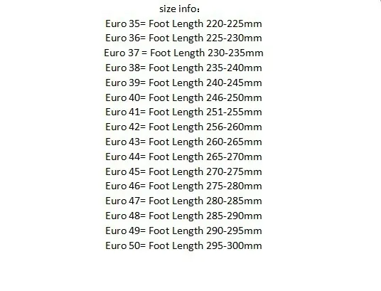 Dear friend, thank you for browsing our products and wish you a happy shopping. There are more high-quality brand products in the store Welcome to the shop to browse As the American shoe size is not exactly the same as the Chinese shoe size, the following shoe sizes are for reference only: (best choice method: check foot length) EU 35 = U.S. 4.5 = Foot length 22-22.5 cm EU 36 = United States 5 = Foot length 22.5-23 cm EU 37 = U.S. 5.5 = Foot length 23-23.5 cm EU 38 = United States 6 = Foot length 23.5-24 cm EU 39 = United States 6.5 = foot length 24-24.5 cm EU 40 = United States 7 = Foot length 24.5-25 cm EU 41 = United States 8 = Foot length 25-25.5 cm EU 42 = United States 8.5 = Foot length 25.5-26 cm EU 43 = U.S. 9.5 = Foot length 26-26.5 cm EU 44 = United States 10 = Foot length 27-27.5 cm EU 45 = United States 11 = Foot length 27.5-28 cm EU 46 = United States 11.5 = Foot length 28-28.5 cm (All dimensions are in centimeters, please note that 1cm = 0.39inch) For example, if the foot is 25.3cm long, US size8 should be selected. Reminder: shoe size is subject to European size and actual foot length. If you don’t know the length of your feet, please follow the steps below to measure the length of your feet. Tip: The size is the maximum size, please allow a tolerance of about ±0.5-1cm. Please carefully compare watch size and foot length before placing an order. 1. Please choose the size according to your foot length 2. If you do not measure the length of your feet, another way is to measure the length of your own shoes according to the length of the insole on the table, and then choose the shoe size Why buy from us? √ Fast global shipping! √ Free tracking number! √ Fast and satisfying communication! √Unique high-quality products! √Best price! 1. If you are not satisfied with some issues, please contact us before leaving us negative feedback, we will always try our best to achieve 100% customer satisfaction. That's why we are here! All emails will be replied within 48 hours (except Saturday and Sunday). Therefore, please do not hesitate to send us an email! 2. Your five-star praise is worthy of appreciation
