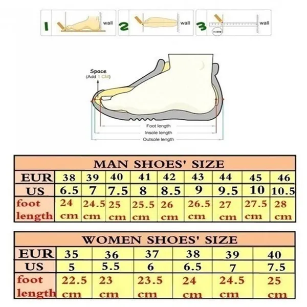 Men's Shoe Size shoes EU Size 37 = US Size 5 = UK Size 4.5 = shoes length 235 shoes EU Size 38 = US Size 6 = UK Size 5.5 = shoes length 240 shoes EU Size 39 = US Size 6.5 = UK Size 6.5 = shoes length 245 shoes EU Size 40 = US Size 7 = UK Size 7 = shoes length 250 shoes EU Size 41 = US Size 8 = UK Size 7.5 = shoes length 255 shoes EU Size 42 = US Size 8.5 = UK Size 8 = shoes length 260 shoes EU Size 43 = US Size 9.5 = UK Size 8.5 = shoes length 265 shoes EU Size 44 = US Size 10 = UK Size 9.5 = shoes length 270 shoes EU Size 45 = US Size 11 = UK Size 10.5 = shoes length 275 shoes EU Size 46 = US Size 12 = UK Size 11.5 = shoes length 280 shoes EU Size 47 = US Size 13 = UK Size 12.5 = shoes length 285 shoes EU Size 48 = US Size14 = UK Size 13.5 = shoes length 290 ======================================================== Women's Shoe Size shoes Size EU 35 = US Size 5 = UK Size 3 = shoes length 225 shoes Size EU 36 = US Size 6 = UK Size 4 = shoes length 230 shoes Size EU 37 = US Size 6.5 = UK Size 4.5 = shoes length 235 shoes Size EU 38 = US Size 7.5 = UK Size 5.5 = shoes length 240 shoes Size EU 39 = US Size 8.5 = UK Size 6.5 = shoes length 245 shoes Size EU 40 = US Size 9 = UK Size 7 = shoes length 250 shoes Size EU 41 = US Size 10 = UK Size 8 = shoes length 255 shoes Size EU 42 = US Size 11 = UK Size 9 = shoes length 260 shoes Size EU 43 = US Size 12 = UK Size 10 = shoes length 265