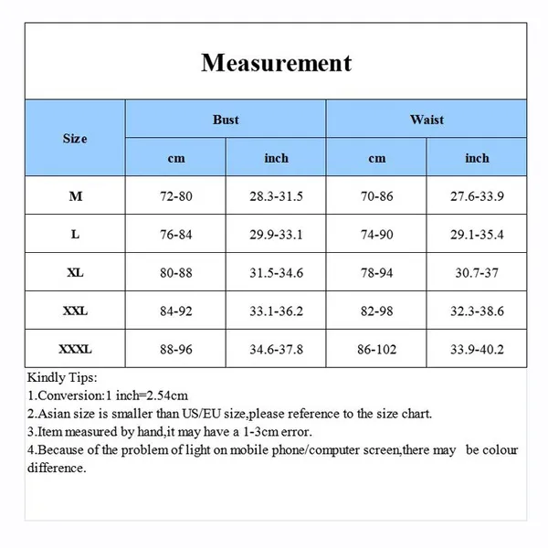 Features Brand New. Color: As picture Gender:Women Material: Spandex Sizes: M-3XL Package Content: 1 PC Kindly Tip: 1. Conversion: 1 inch= 2.54cm Size Approximately : These size is about Asian Size,general get one size smaller than US/EU size,Please reference to the size chart in the picture. Item Measure by hand, it could be 1-3cm different. hope you can understanding, will be sincerely appreciated. 2 .Please be reminded that due lighting effects, monitor's brightness/ contrast settings etc, there could be some slight differences in the color tone of the website's photo and the actual item.