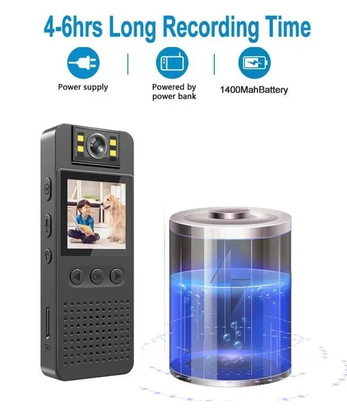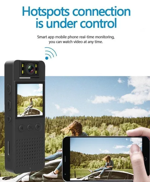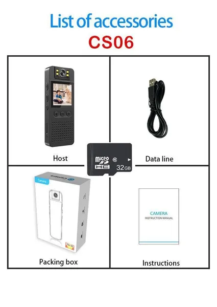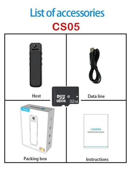 Specification: 1. Support video replay. 2. Video Format: MOV format 1920*1080P 3. Photo Format: JPG 4. Audio Format: WAV 5. WIFI AP connection,wireless distance is 10m. 6. 4pcs led fill light 7. Support TF Memory Card: 8GB to 128GB (FAT32) 8. Battery Capacity: CS05 Camera- 3.7V/1400MA lithium battery CS06 Camera- 3.7V/1000MA Lithium battery 9. 4-6hrs long recording time 10. Motion detection distance: straight line 5 meters 11. 180° Rotating camera len 12. Back clip design 13. Plastic body shell 14. Size (MM): 96mmx38mmx16mm Package list:(CS05 or CS06 for choose) 1x camera 1x usb cable 1x 32GB TF Card 1x English manual 1x packing box