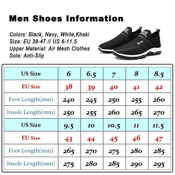Men Outdoor Sports Shoes Running Sneakers Casual Comfortable Knitted Mesh Breathable Hiking Camping Shoes Wear-resistant Anti-Slip Trekking Shoes Calzado Deportivo de Hombre. New Men Casual Knitted Breathable Sneakers Outdoor Anti-Slip Travel Camping Hiking Shoes Light Weight Flat Sport Shoes Air Mesh Breathable Sock Shoes Indoor Outdoors Comfortable Soft Sole Running Shoes Athletic Tennis Shoes The shoes are ultra-lightweight, providing comfortable wearing. The knitted socks shoes, this material is very flexible and can fit your feet perfectly, fully around elastic enclosed fit to your foot. With an anti-slip soft sole, give your comfortable whole days Mesh breathable suitable for summer, when you doing exercise, traveling with family, or camping hiking outdoors. Your foot also needs a dry and breathable space. And there is a little design, one loop at the back, it could help you easy to put on. The rubber sole would be wear-resistant, and you could wear it in daily life. Gender: Men, Boys, Male. Function: Wear-resistant, Comfortable Soft Sole, Round Toe, Slip-On, Anti-Slip, Lightweight, Air mesh, Breathable, Socks shoes. Style: Leisure, Outdoors Occasion: Daily Life, Indoor&Outddor, Gym, Doing Exercise, Running, and so on. Upper Material: Flexible air mesh breathable clothes Toe shape: Round Toe Closure Type: Slip-On Sole: Rubber Sole (And there are 2 kinds of sole, used in different color shoes, please have attention.) Colors: Black, Navy, White, Khaki EU Size: 38-47 / US Size 6-11.5 Note: 1, Please check the size chart carefully before you buy the item. The size chart is shown in the product picture. 2, If your foot is wider or thicker, please choose 1 size larger. 3, Please note that a slight color difference should be acceptable due to the light and screen. 4, If you have any questions please contact us.